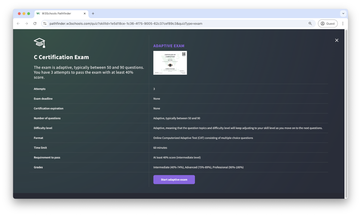 The C exam is a test that summarizes the W3Schools C syllabus.