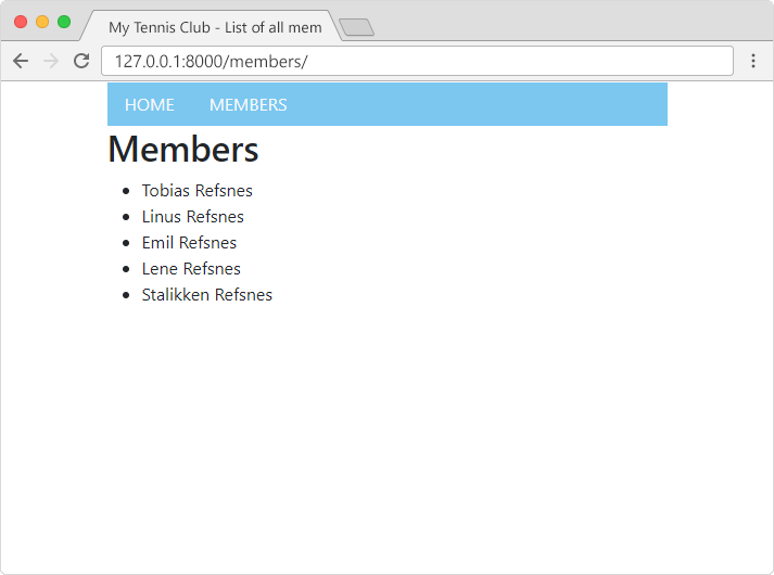ThThe My Tennis Club project already has a stylesheet, remove it and the Members page without styling will look like this: