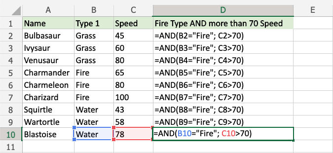 Now each row has a check for both being Fire type and Speed greater than 70:
