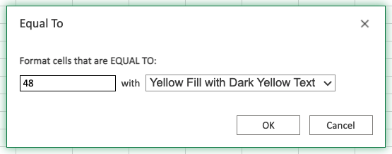 Now, the cells with values equal to "48" will be highlighted in yellow: