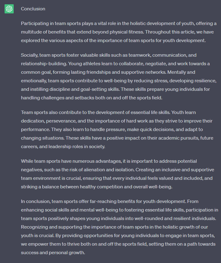 For an article about "The importance of team sports for youth development", write a section about "Conclusion - Summary of the above points":