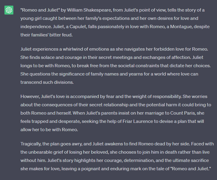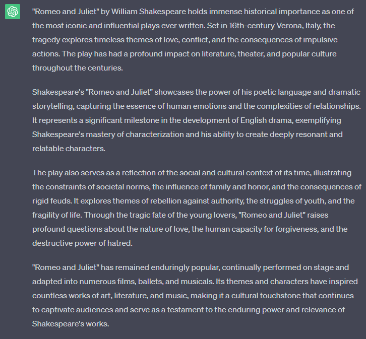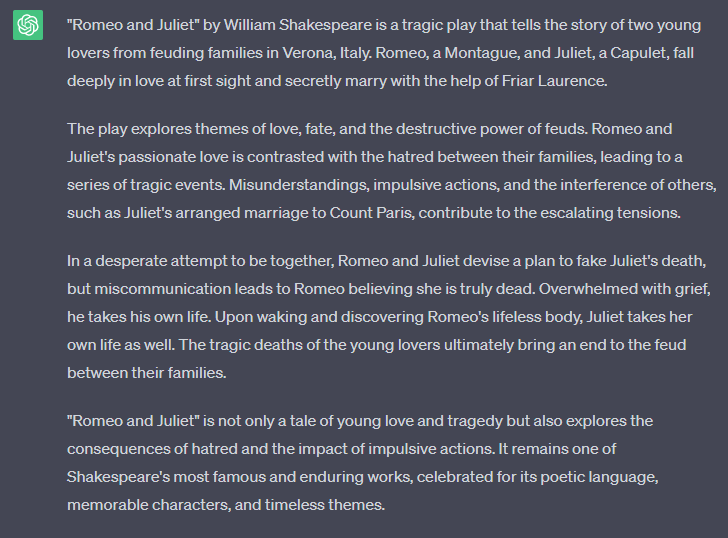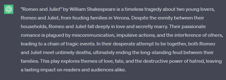 The previous example provided a basic summary of "Romeo and Juliet", but let's try and ask a few different ways: