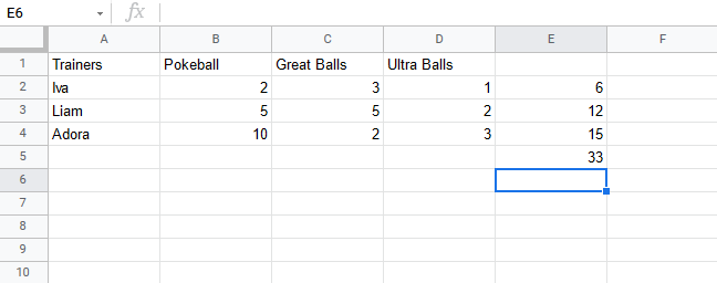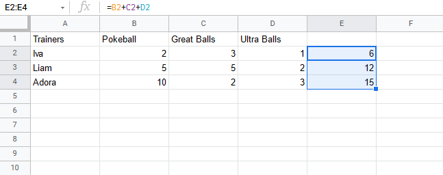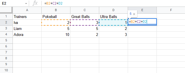 Let's help Iva to count her Pokeballs. You find Iva in A2(Iva). The values in row 2 B2(2), C2(3), D2(1) belong to her.