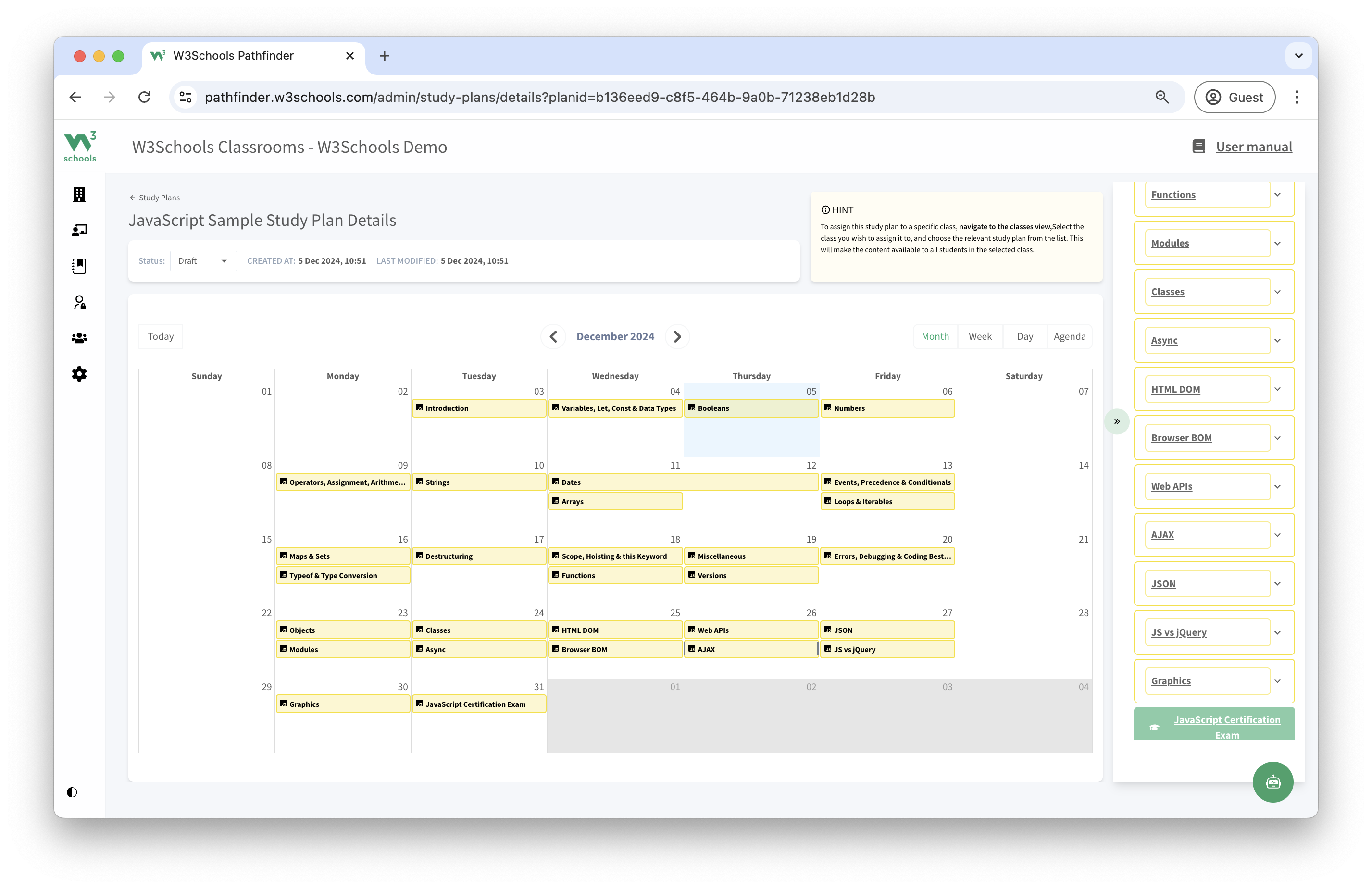 This study plan is a feature of W3Schools Academy.